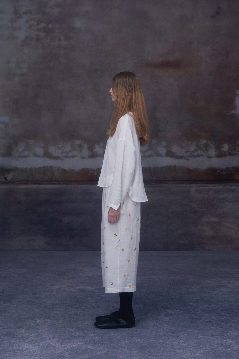 這款寬鬆居家七分褲以白色為底,搭配精緻花朵刺繡,展現清新雅緻的氣質。